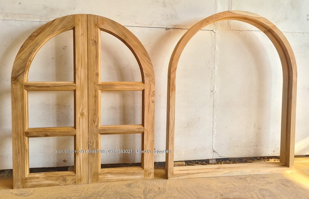 วงกบไม้สักโค้งเป็นวงกบประตูที่มีลักษณะโค้งด้านบน นิยมใช้กับบ้านพักอาศัย รีสอร์ท และอาคารที่ต้องการความสวยงามโดดเด่น ผลิตจากไม้สักแท้ สามารถสั่งทำตามขนาดช่องเปิดจริงได้