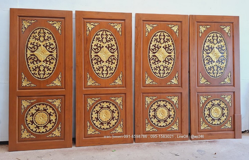 ->หากประตูมีลวดลายการแกะสลักลาย จะราคาที่บานละ 1,400 บาท เพราะลวดลายแกะสลักจะต้องมีการลงสีพื้นลายแกะ และมีการแต้มสีทองตรงลายแกะ สีทองจะเพิ่มความโดดเด่นให้กับประตูมากยิ่งขึ้น